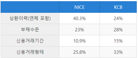 아래 표를 보시면, 나이스 신용 평가와 KCB 신용 평가 에서 신용등급 점수를 평가할때, 가중치가 다름을 알 수 있습니다.