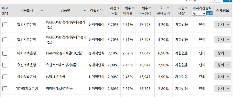 - 저축 은행 적금 이율 높은 은행 : 웰컴 저축, DB 저축 은행 등등