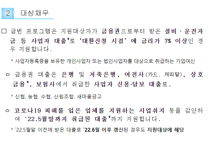 사업자 대출을 받았으며, ㅇ대환신청 시점에 금리가 7% 이상인 경우만 지원을 합니다.