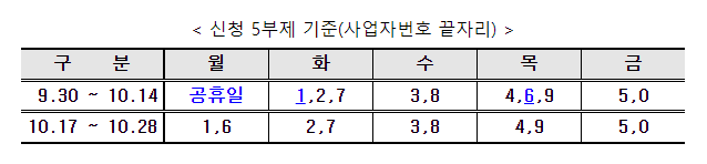 9월 30일부터 시작하는 신청 접수는 최초 1달간은 사업자번호 끝자리 기준으로 진행 예정입니다.
